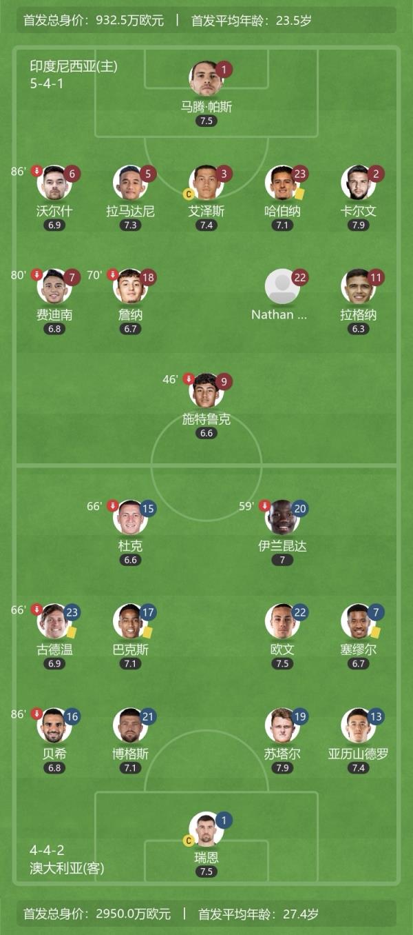 本场比赛印尼541阵型,遭澳大利亚狂轰19脚打门,最终印尼在主场顽强拿下1分。