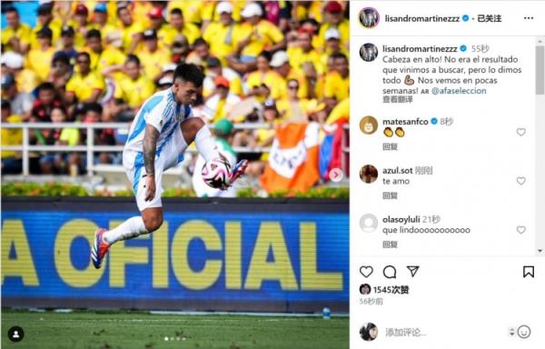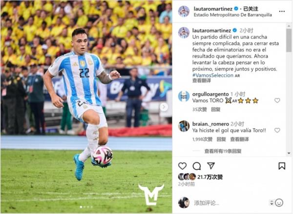 9月11日讯 在南美世预赛第8轮比赛中,阿根廷客场1-2落败于哥伦比亚。阿根廷前锋劳塔罗在社交媒体上晒出自己的比赛照片,并写道:“在一个总是很困难的客场踢了